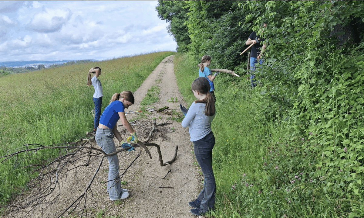 Ja, es sind die Asthaufen, die von Kindern gebaut und von Zauneidechsen geliebt werden. Am Dienstagmorgen, 3. Juni 2025, haben unter der Leitung des Natur- und Vogelschutzvereins Burgdorf und Umgebung (NVB) rund 50 Primarschülerinnen und -schüler aus Bäriswil tatkräftig angepackt: Sie schleppten, sägten und stapelten Äste und schnitten Dornen zurück. So entstanden am Bäriswiler Waldrand vier prächtige Asthaufen für die Zauneidechsen, und auch ein Steinhaufen wurde für die wärmeliebenden Zauneidechsen von beschattendem Dornengestrüpp befreit. Die Zauneidechse steht auf der «Roten Liste bedrohter Tier- und Pflanzenarten» und ist auf sonnige Waldränder mit vielfältigen Kleinstrukturen angewiesen.